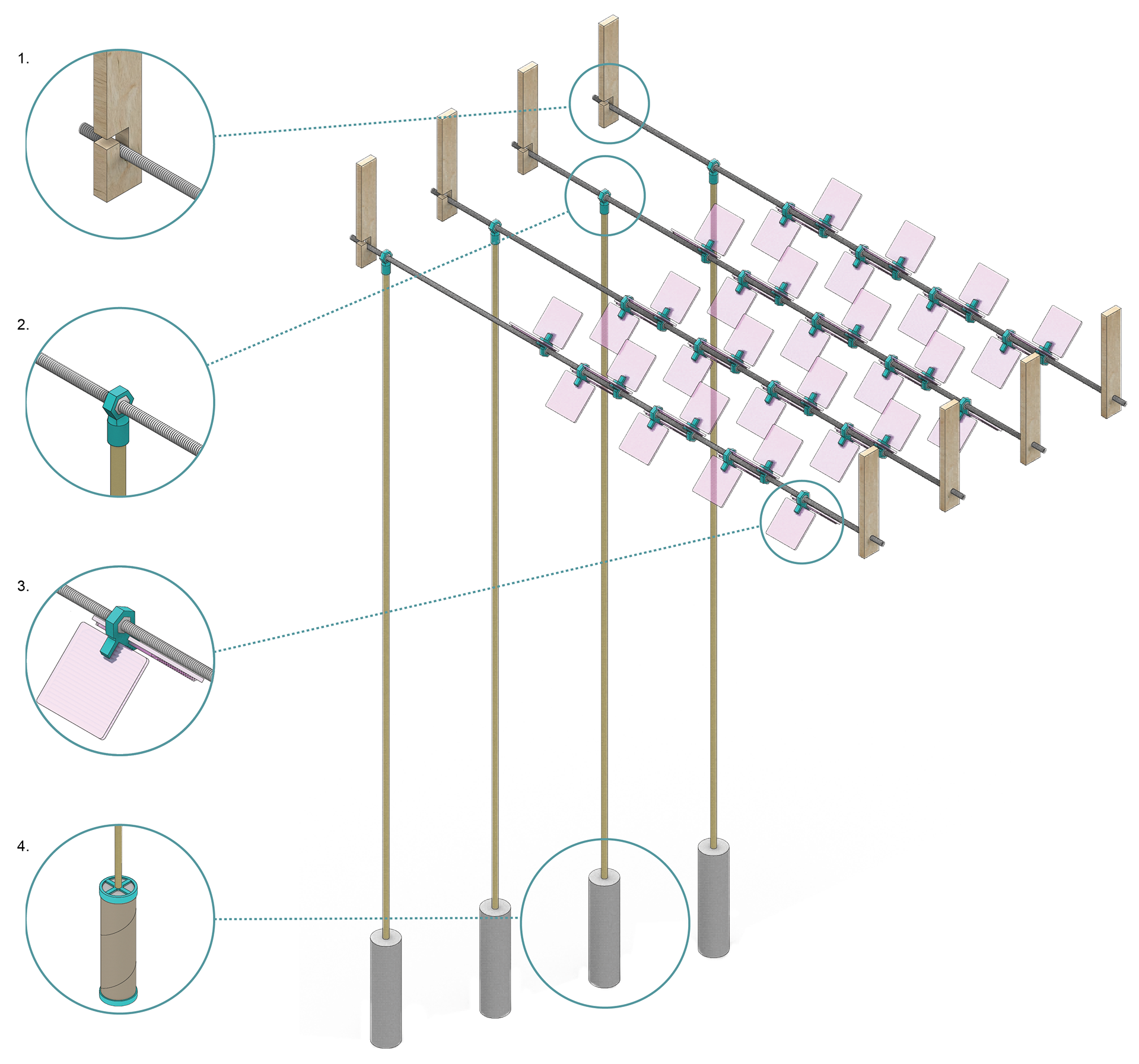 2. Custom 3D printed, teal connections were made to both hold a popular dowel rod and a 1/2” lock nut. This allowed the threaded rods to be rotated which allowed the users to alter the orientation of the tiles and in turn the shadows and refraction.