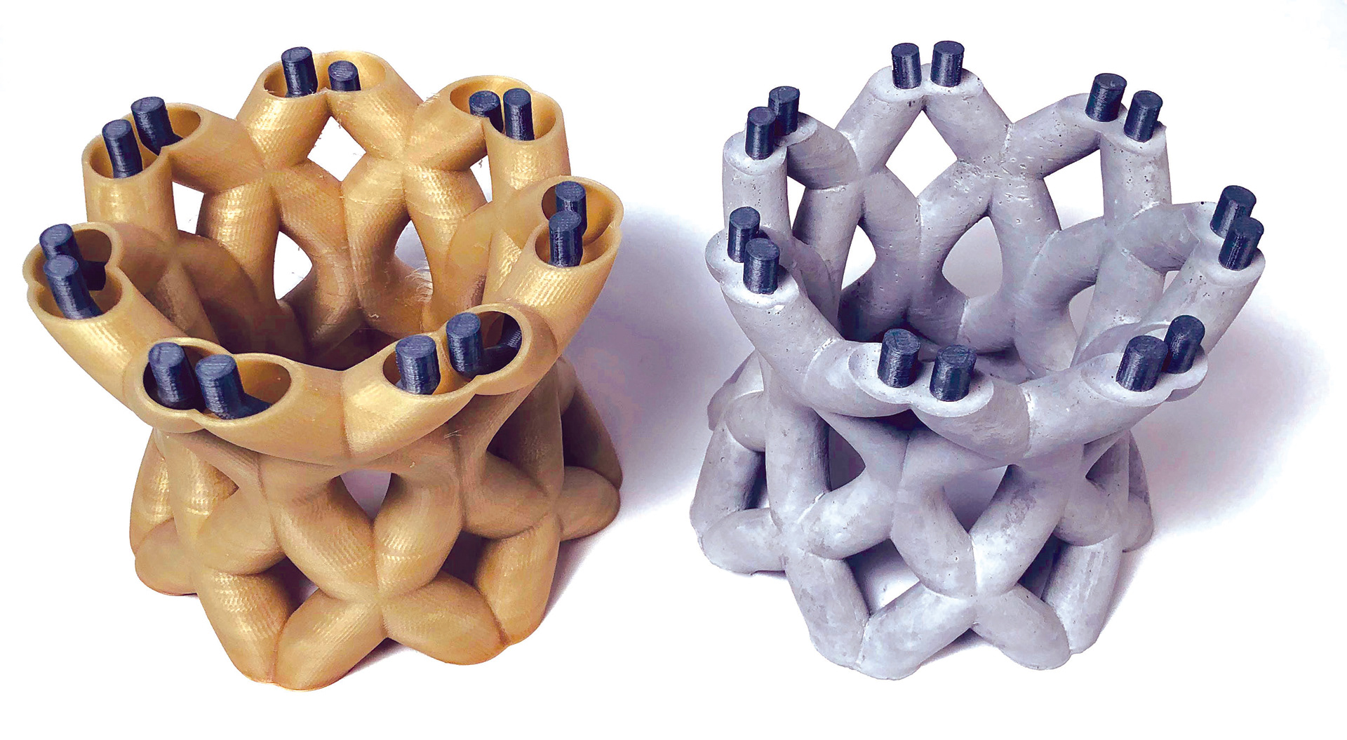 On the left, PVA form with embedded PLA printed reinforcement. On the right, resulting HEC (Rockite) cast form with embedded PLA reinforcement after the PVA was dissolved with water.