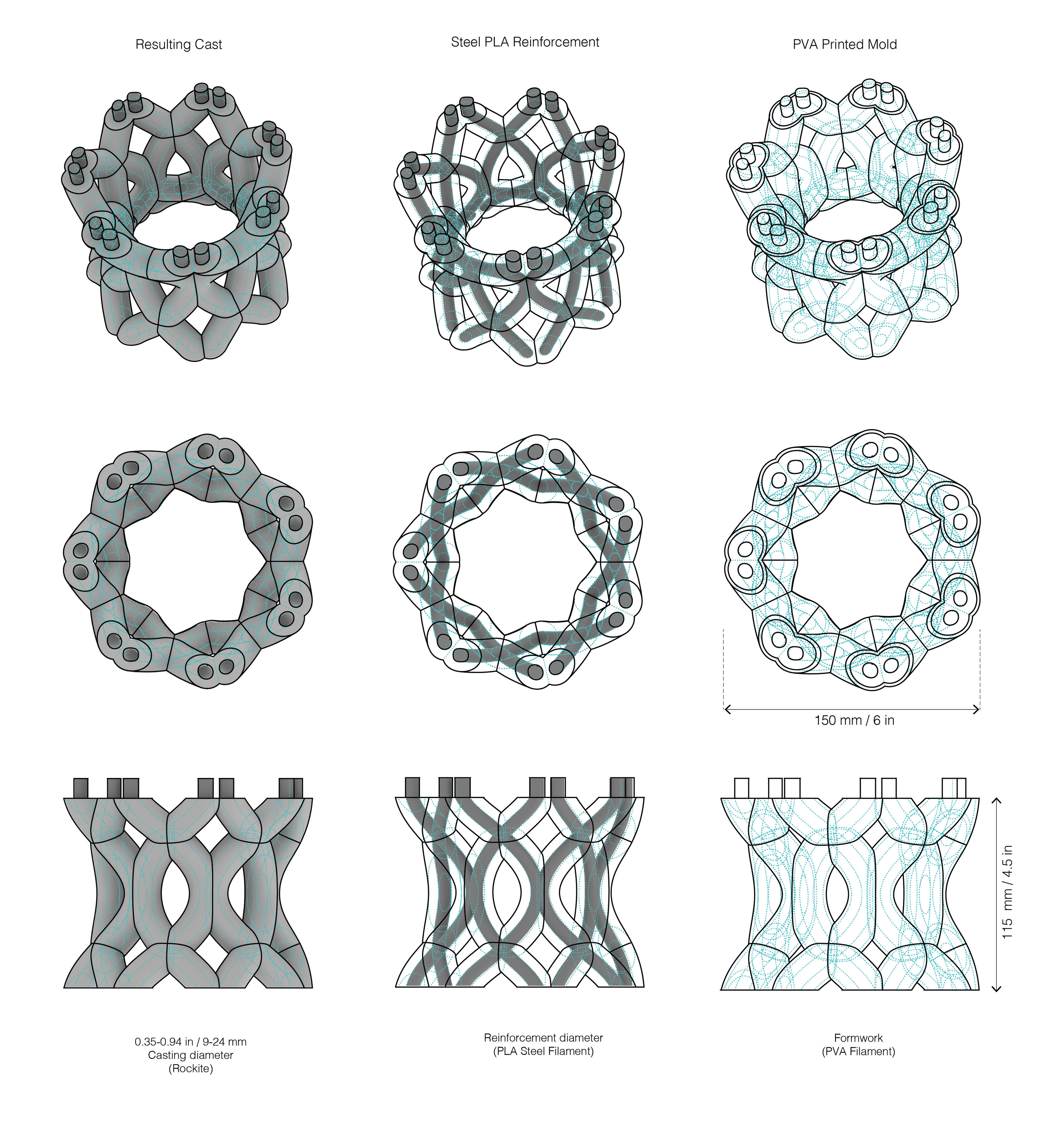 To the left is the embedded reinforcement printed separately for clarity, in the middle the PVA mold printed separately for clarity, and to the right the PVA mold printed with embedded reinforcement.