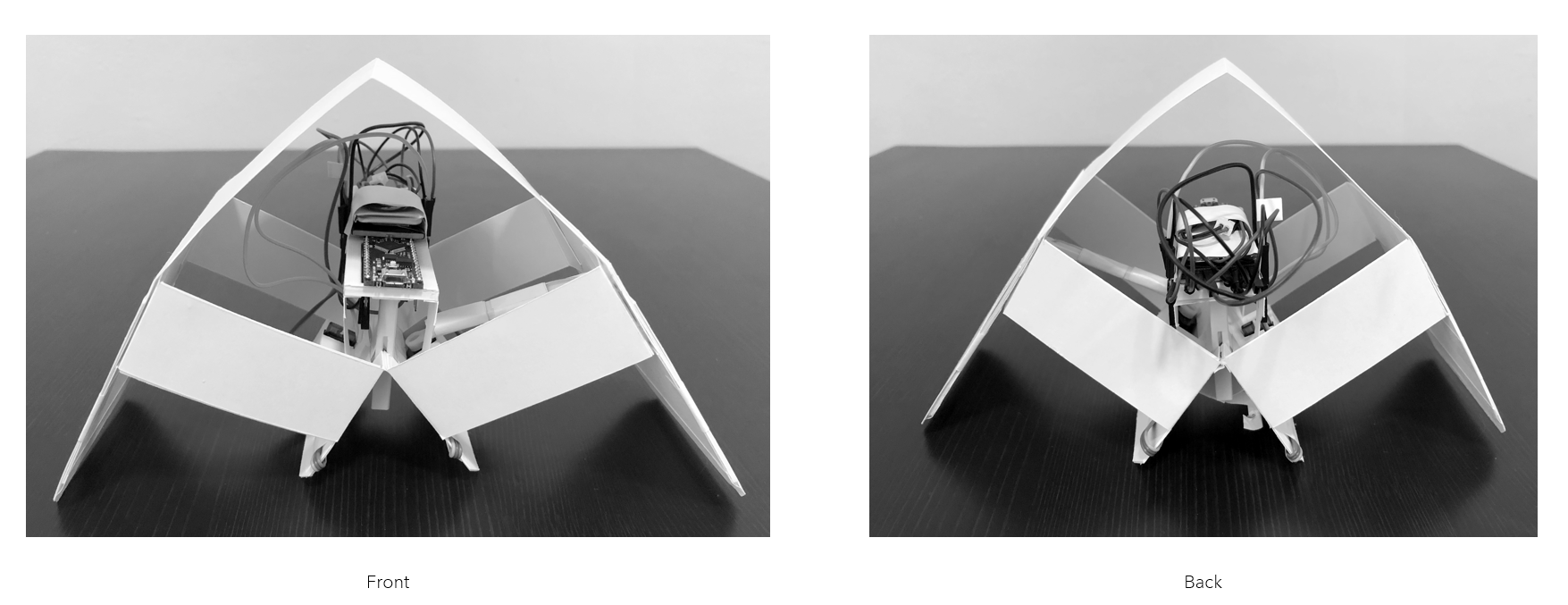 A servo motor was added to the center of the robot. Initially the connection was through the front of the wing. This was quickly moved to the side making it perpendicular to the center of the robot. This design change allowed for less bending of the wings and a cleaner aesthetic. The wing was connected to the servo motor arm with a wire.
