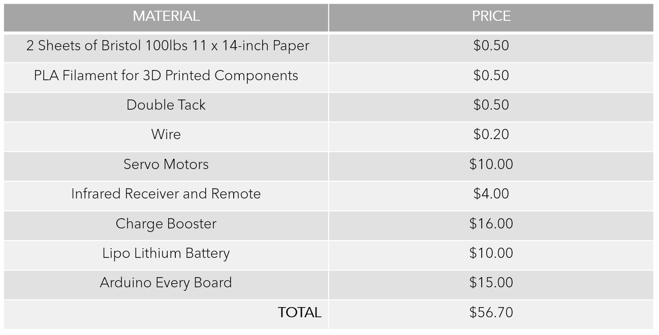The total cost of the robot was approximately fifty-six dollars seventy cents. The fabrication components were quite cheap at one dollar forty-five cents with the bulk of the cost being the electronics.