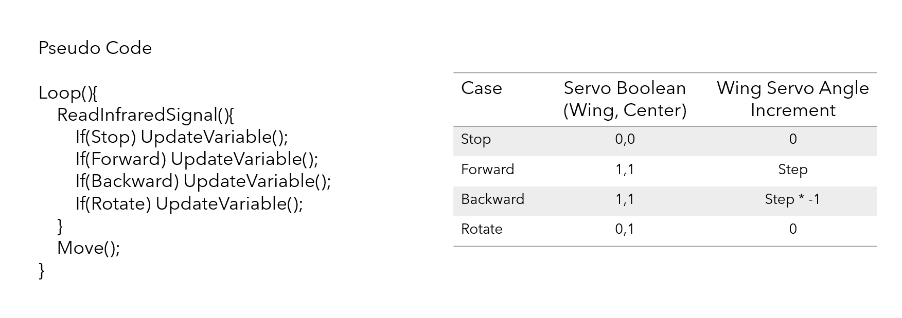 Rather than using a physical alteration to the robot's outer legs to gain control of steering it was decided to lean into the natural movement to the robot to its right. As a result, four types of movement were created. These movements included stop, forward, backward, and rotate. The forward and backward motion toggled between a positive and negative rotation step of the servo motor controlling the wings. The rotate or turning motion was controlled by solely actuating the central servomotor which allows the robot to pivot.