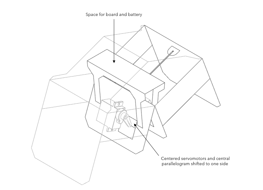 Using a new double parallelogram logic for the central mechanism we were able to get the robot to slightly lift off the ground at its center.