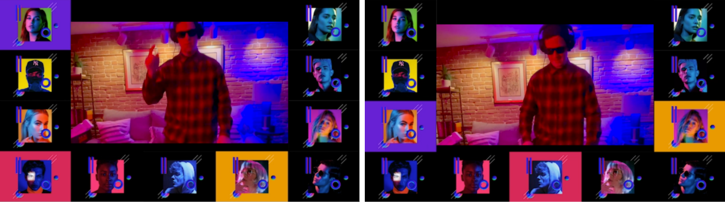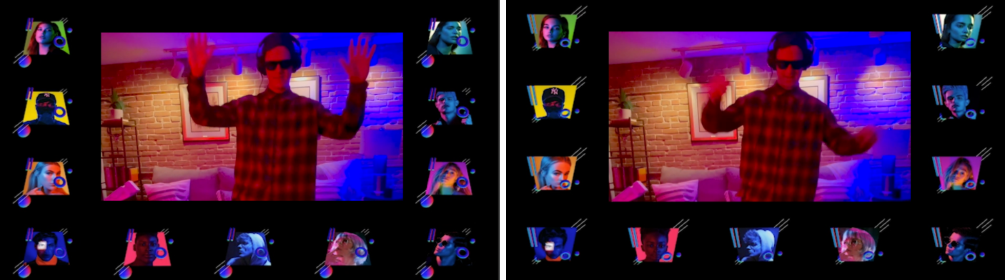 With the integrated microphone and accelerometer on the Audience Input Kit (AIK), a participant can control his/her avatar on the browser with audio and motion. The size of the avatar is corresponding to the sound amplitude. When clapping, cheering, or tapping with the AIK, a participant can light up the AIK and control the avatar by its scale (Figure 3). The angle of the avatar changes according to the accelerometer input. When dancing with the AIK, the participant's avatar will "dance" simultaneously (Figure 4). The color of the AIK, the participant's room light color (if any), and the avatar background color are synchronized. A participant shakes the AIK to trigger the color changes (Figure 5).