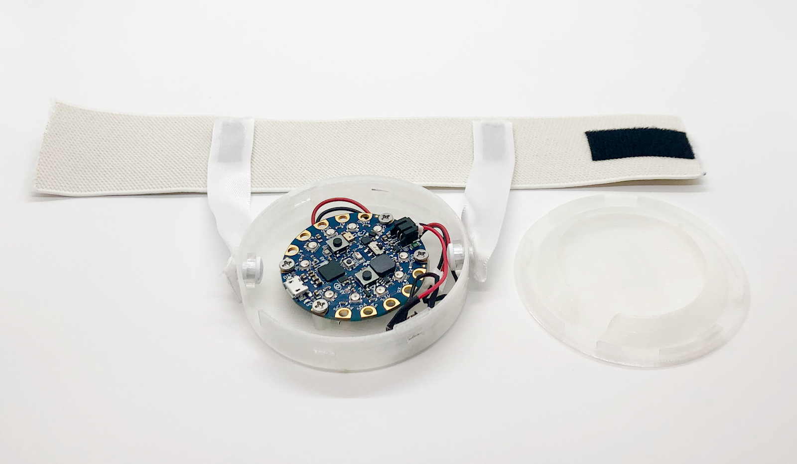 The device is simple and low cost at just under forty dollars with the majority of the listing being the Adafruit Playground Express Bluefruit at twenty-four US dollars ninety-five cents. The enclosure where the microcontroller was housed was 3D printed with clear Polylactic Acid (PLA) filament. The clear filament was chosen so the light- emitting diode (LED) lights of the Adafruit Playground Express Bluetooth. Apertures were placed within the walls of the enclosure allowing for additional sound and light to enter and exit the enclosure. A large aperture was placed at one side to allow for updated programs to be uploaded to the microcontroller via a USB connection. This design allowed for the integration of an on/off switch that controls if the microcontroller is powered. Two additional plastic connectors and acrylic spacers were used to pin the straps to the enclosure. Velcro was used to hold the strap and elastic band. This could allow for the users to change their bands colors and sizes. A diagram depicting the aforementioned components can be seen in figure 10. While there are most likely more uses for this device two possible uses we focused on were a beverage holder and a wearable (Figure 13).