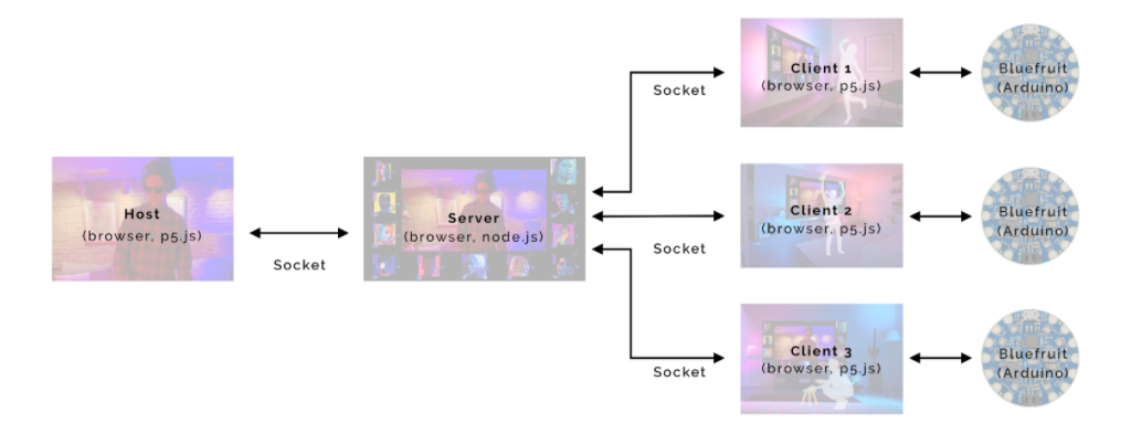 The DJ and audiences are connected via a live-stream platform. As seen in figure 1, the DJ broadcasts the video live and 360 audio to all participants through the platform. Participants are divided into groups of 10-20 people and assigned to one virtual room. In participants' physical rooms, they may project the video on the wall to create an immersive experience. Each participant has an Audience Input Kit that can take their audio and motion input. With the kit, a participant can control the avatar on the platform and dance with it. Figure 2 shows the technical system architecture. Via server, a host can talk to multiple clients, and everyone will view the concert on the browser. On the client side, one Adafruit Playground Express Bluefruit talks to one client browser to control the participant's avatar.