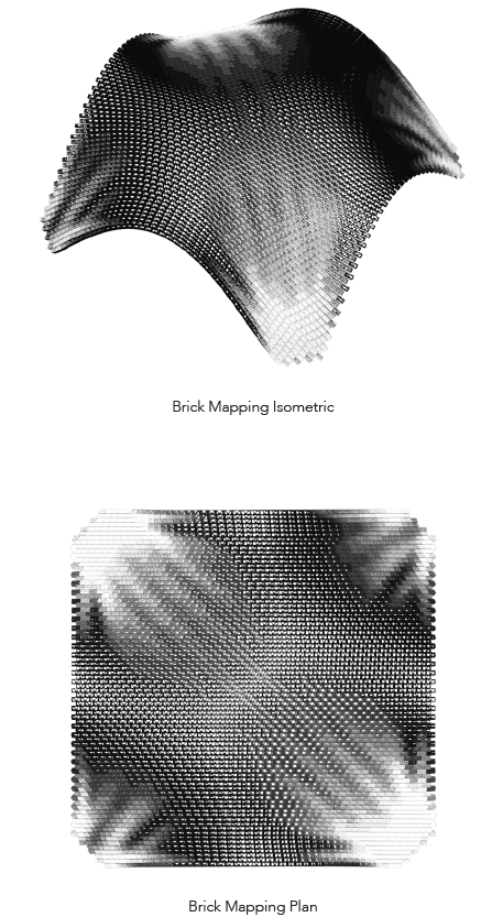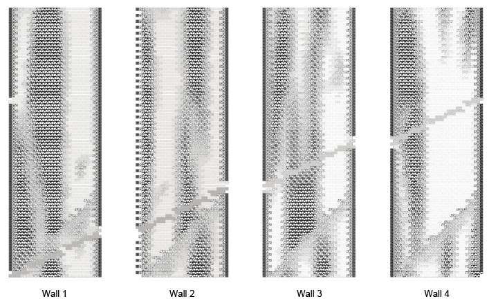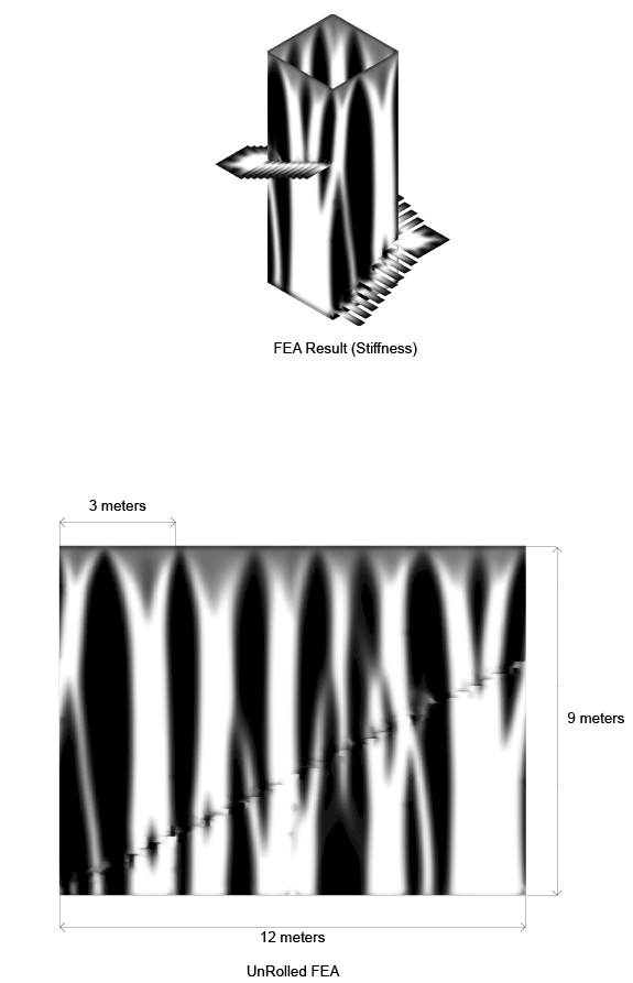The diagrams at right denote the stiffness map from the FEA optimization. The white areas are where the most structural stiffness is desired while the least is required in the black areas. The rightmost diagram is an unrolled stiffness map of the three-by-three-meter masonry core.