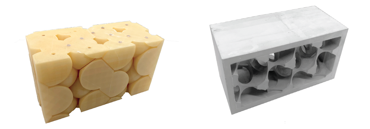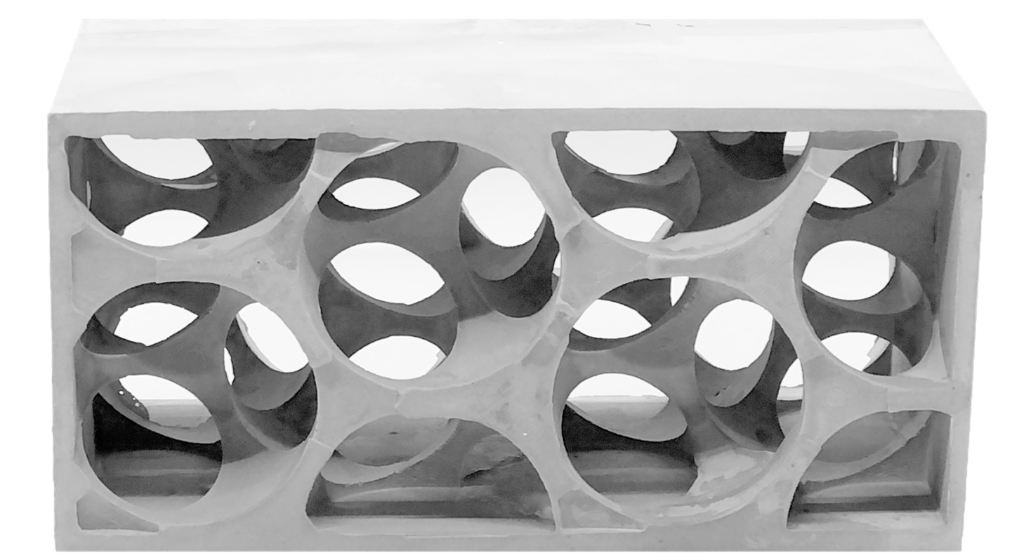Our project NuBlock brings a modern and aesthetic update to an architectural and structural elementary unit—brick. With its innovative water-soluble formwork, this project can create lighter concrete bricks through a gradient of variable porosities with intricate geometries and infinite customizability. Thanks to its customizability, NuBlock’s porosity can directly relate to its location’s structural need. In areas where greater structural stiffness is required the block is denser and vice versa. The goal is to minimize the quantity of material necessary through formal optimization while maintaining its structural performance and decreasing the embodied carbon latent in concrete fabrication.