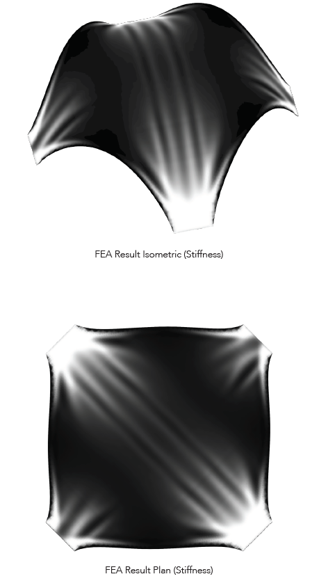 The diagrams at above denotes the stiffness map from the FEA optimization. The white areas are where the most structural stiffness is desired while the least is required in the black areas.