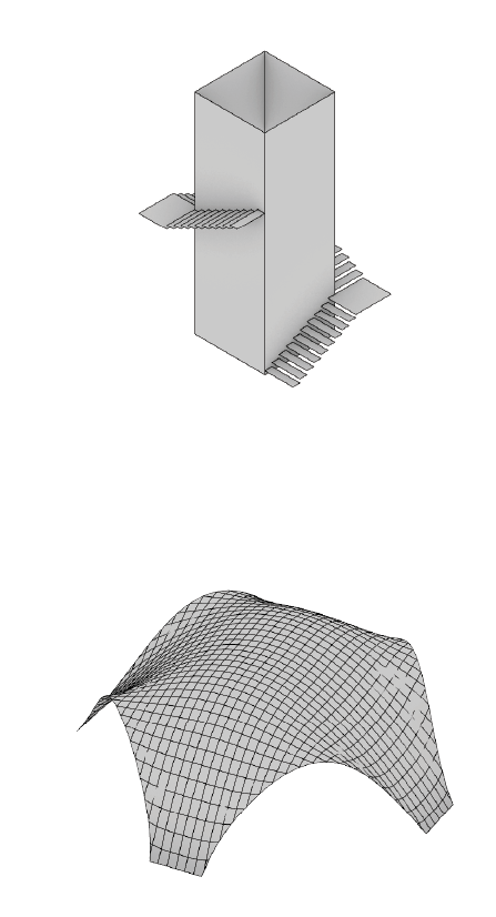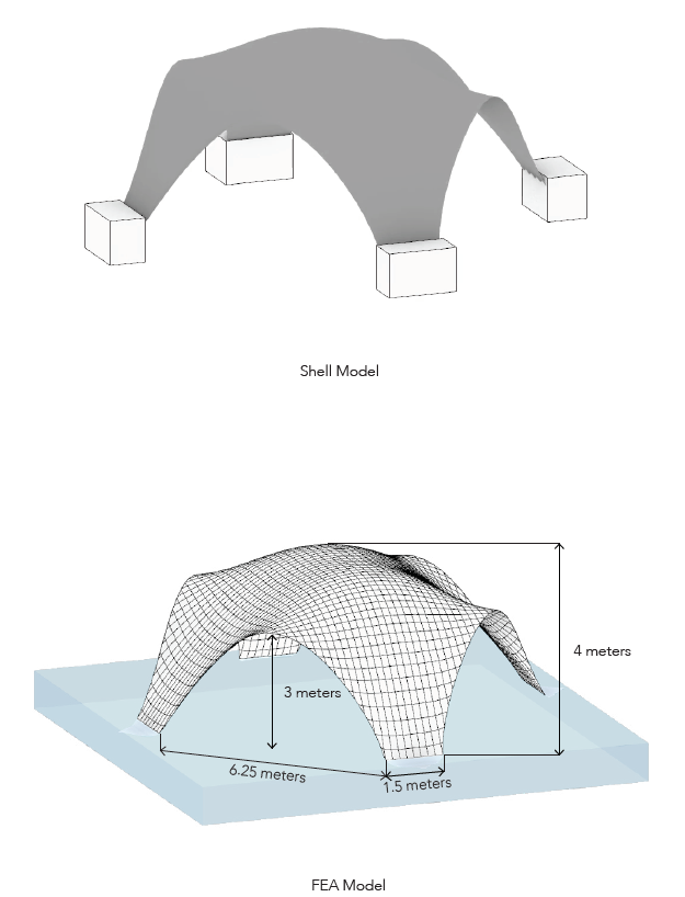 The shell model analyzed and optimized a Catalan vault with its self-weight. The geometry was generated through the draping of a chamfered square which created the most efficient structure. Each anchor is one and one-half meter in length. The openings are six and one-quarter meters wide and three meters tall. The structures height is four meters.