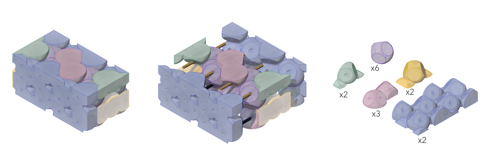 A new fabrication method was developed for this project since a small desktop 3D printer was being used for the project since a small desktop 3D printer was being used for the project with a 16 x 16 centimeter boundary. This method allowed for the creation of multiple parts that could be held together with wooden dowels. This new strategy eliminated the material bridging and need for support structures as a result of where the components were cut. This allowed for the block's volume to increase since the entire block was not being printed at once. The volume of the second block was 20 cm (L) x 10 cm (W) x 10 cm (H).