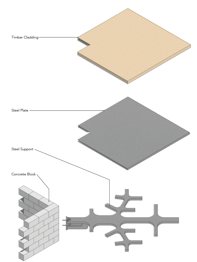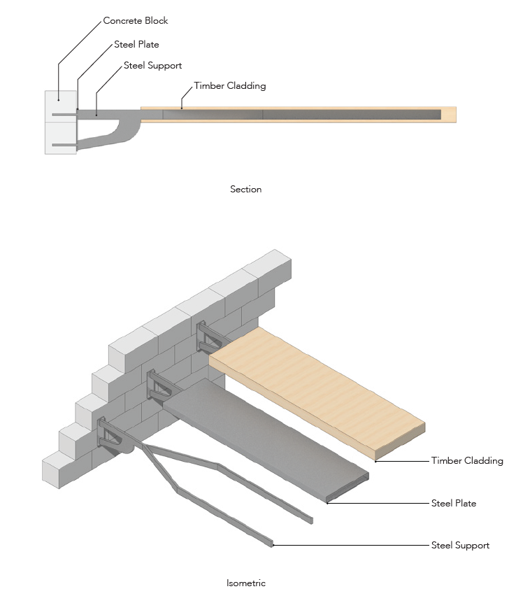 A stair was designed to be subtle and complement the block, with the intention of not taking away focus from the porous concrete blocks. The stair’s steel support assembly was designed using Finite Element Analysis. This analysis allowed for the development of a rectangular extrusion steel support. This support would be cast into the concrete blocks. The steel support would be clad with a steel plate and timber.