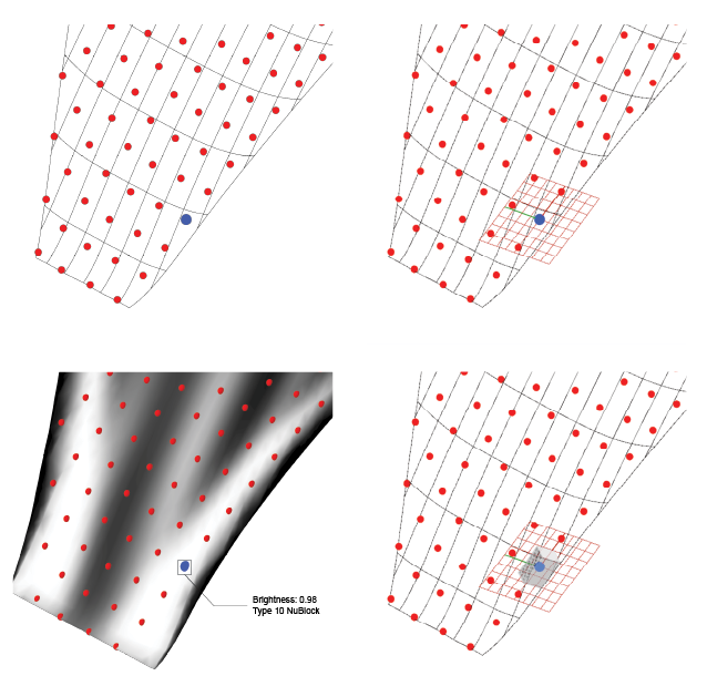 In order to map NuBlocks according to the stiffness map from finite element analysis and optimization, a grid was populated onto the surface and used to sample the UV tangents (and/or contour line tangents), and stiffness map brightness, which are used to determine the block orientation and type. The selected bricks are mapped onto the surface so that their centroids are at the corresponding grid points.