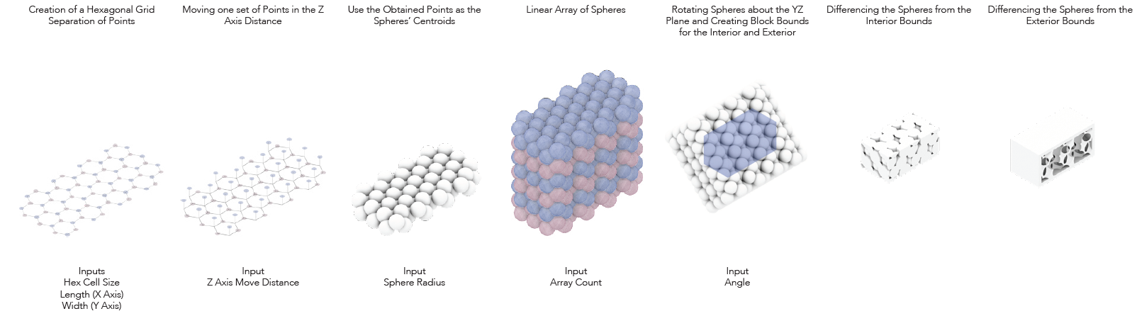 The brick was based off hexagonal sphere packing. The cell size determined the density of the spheres which allowed for varying porosities. The angle of the sphere array can be changed to allow for varying direction of porosity that can augment the view or the lighting. The spheres were used to remove material from a block. An exterior boundary remained on four sides to make the module more legible once populated on a structure.