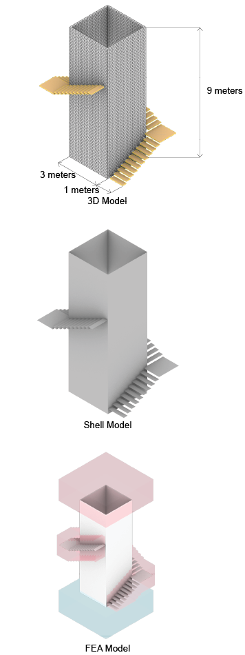 The staircase core case study started with a finite element analysis in Millipede, a plugin for McNeel’s Grasshopper, of the structure. The 3D model at left was translated into a shell model to be analyzed and optimized. The staircase wraps about the three-by-three-meter masonry core which is nine meters tall. The model on the right shows the model that was input into Millipede. The structural load is represented in pink. The stair is loaded with five-thousand newtons per square meter with a safety factor of three while the roof load is two-thousand newtons per square meter and a safety factor of five. The blue denotes the support structure.